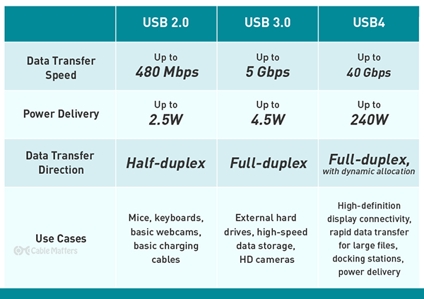 Differences between USB 2.0 vs. USB 3.0 vs. USB4